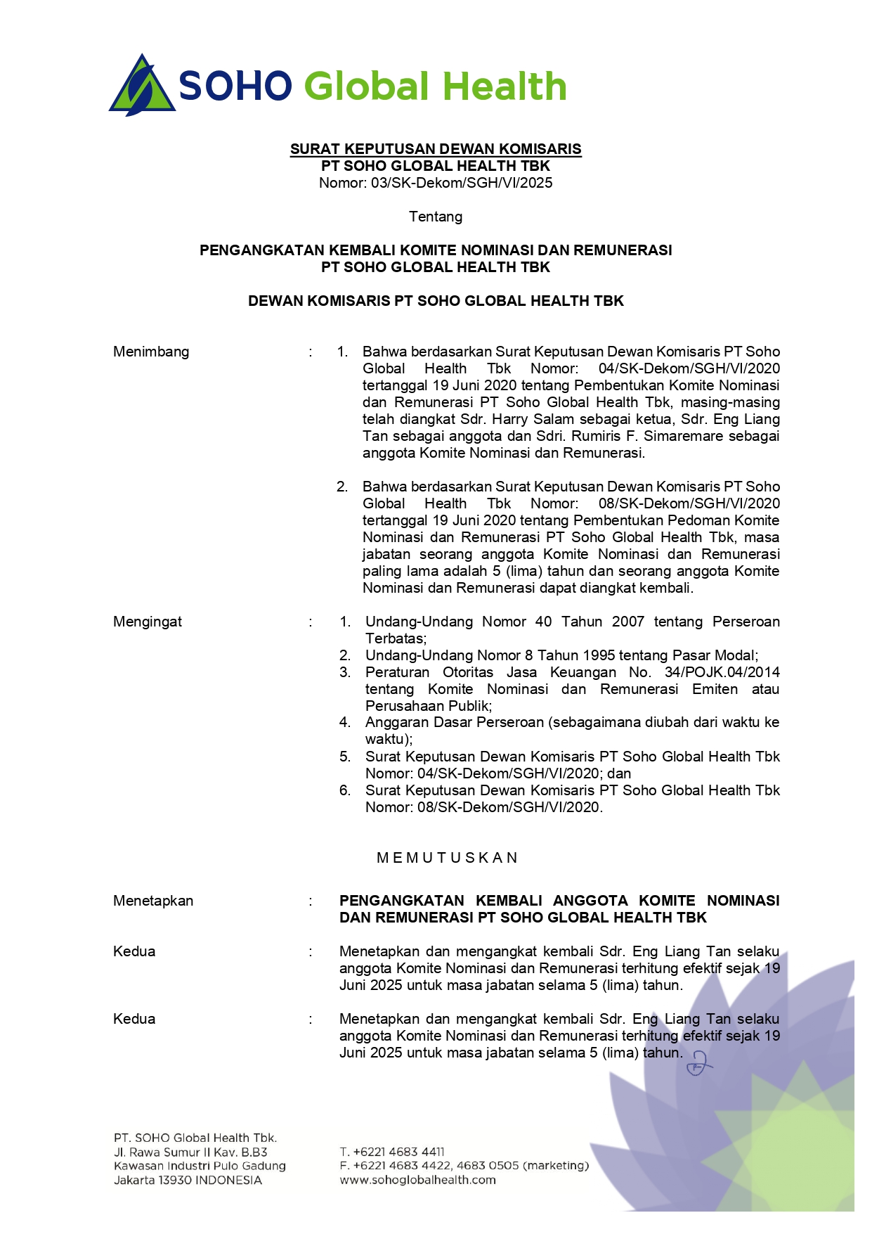 The establishment of the Nomination and Remuneration Committee refers to OJK Regulation No. 34/POJK.04/2015 concerning the Nomination and Remuneration Committee of Issuers or Public Companies. With the existence of the Nomination and Remuneration Committee, the Company wishes that the process of selecting and making remuneration policies can be carried out in accordance with professional and independent considerations, honest and fair, and without any pressure from any party.