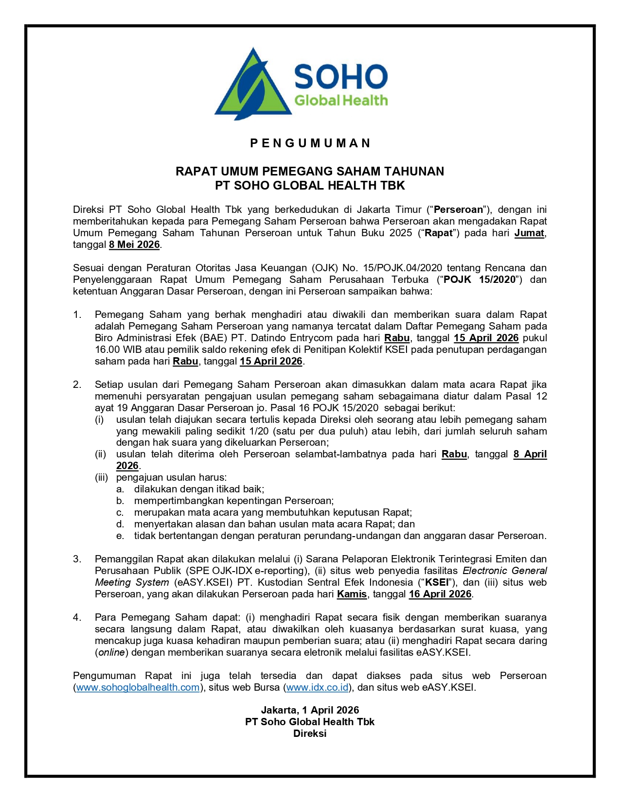 | Contact | Corporate Secretary Tel : 62-21-2985-88888 Fax : 62-21-2985-8800 E-mail : corporate.secretary@sohoglobalhealth.com |